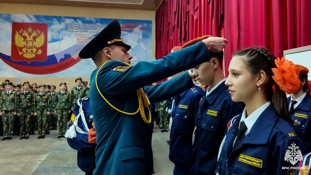 После торжественного обещания глава администрации города Байконур Константин Бусыгин и начальник Специального управления ФПС № 70 МЧС России Владимир Ворона вручили каждому новоиспеченному кадету оранжевый берет — символ МЧС.